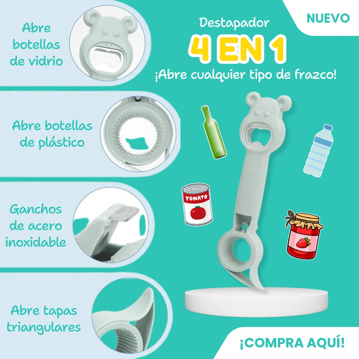 El Abridor 4 en 1 está diseñado para facilitar la apertura de diferentes tipos de envases sin esfuerzo. Su estructura cuenta con varias secciones adaptadas a distintos tipos de tapas, permitiendo un agarre firme y seguro. Gracias a su diseño ergonómico, minimiza la fuerza necesaria, evitando lesiones o incomodidades al abrir frascos y botellas.