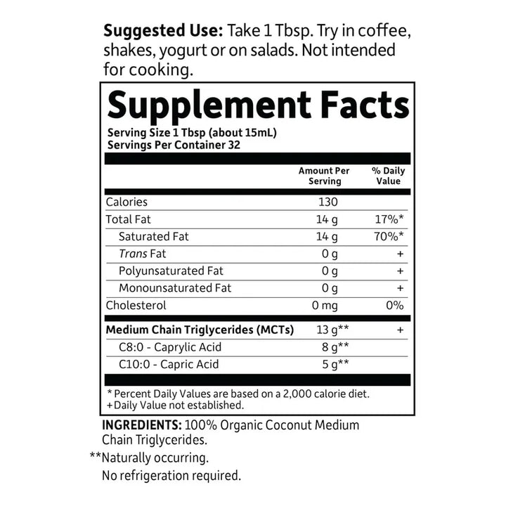 - ✨ Versatilidad: Úsalo en batidos, ensaladas o directamente para maximizar tu ingesta de MCTs.