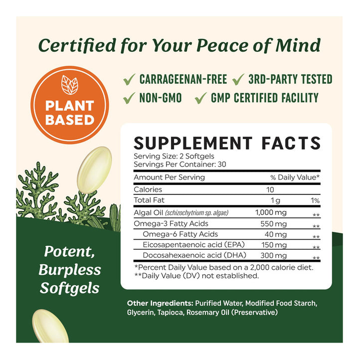 La fórmula avanzada de nuestro aceite de algas, derivada de microalgas cultivadas responsablemente en los Estados Unidos, te ofrece 550 mg de ácidos grasos Omega 3 en cada dosis, ayudando a mejorar cada aspecto de tu bienestar físico y mental. Al elegir nuestro producto, te conviertes en parte del cambio hacia un futuro más sostenible, donde la salud personal no está reñida con la ecología 🌱.