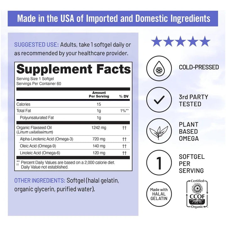 El Aceite De Linaza Orgánico Prensado en Frío se diferencia por ser un aliado indiscutible en la protección de tu corazón y mejora general de tu salud. Cada cápsula blanda contiene 720 mg del más puro ALA, asegurando que cada dosis trabaje incansablemente para apoyar tus funciones cardíacas y cognitivas.