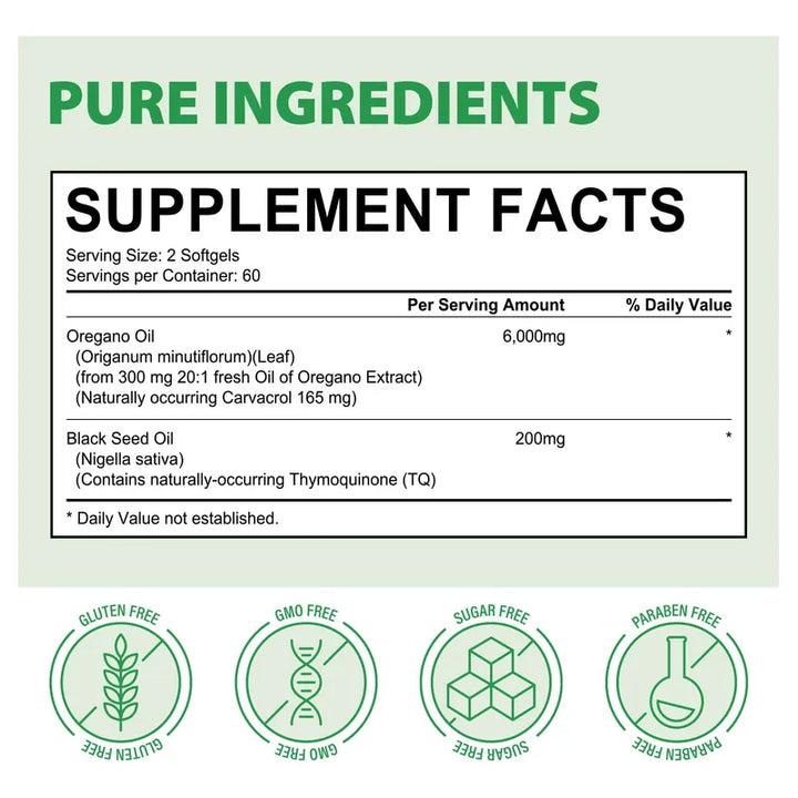 Las cápsulas de Aceite de Orégano con Semilla Negra funcionan al combinar los beneficios del orégano silvestre y las propiedades de la semilla negra, ofreciendo apoyo al sistema inmune y digestivo. Carvacrol y timoquinona actúan juntos para fortalecer las defensas del cuerpo y mejorar la salud digestiva.