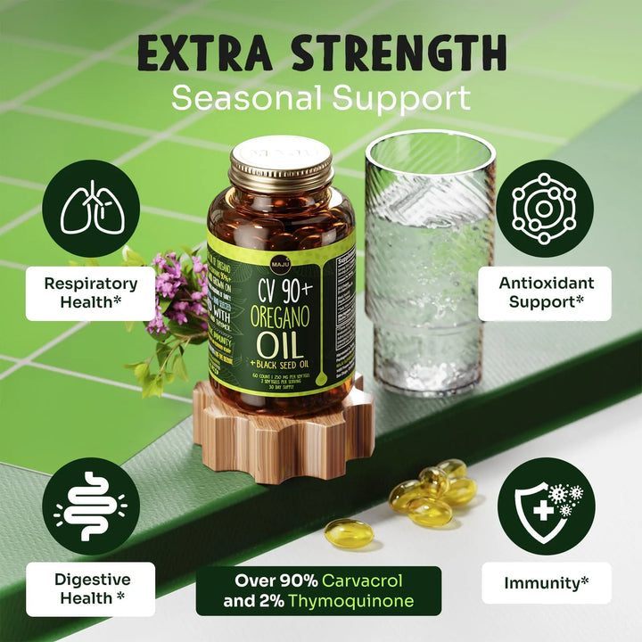 El aceite de orégano y semilla negra trabajan en sinergia para ofrecerte beneficios integrales. El Carvacrol, presente en altas concentraciones, actúa como un potente antimicrobiano y antiinflamatorio, mientras que la timoquinona del aceite de semilla negra proporciona antioxidantes que combaten el estrés oxidativo. Juntos, estos compuestos apoyan tu bienestar general, desde la salud interna hasta la apariencia externa.
