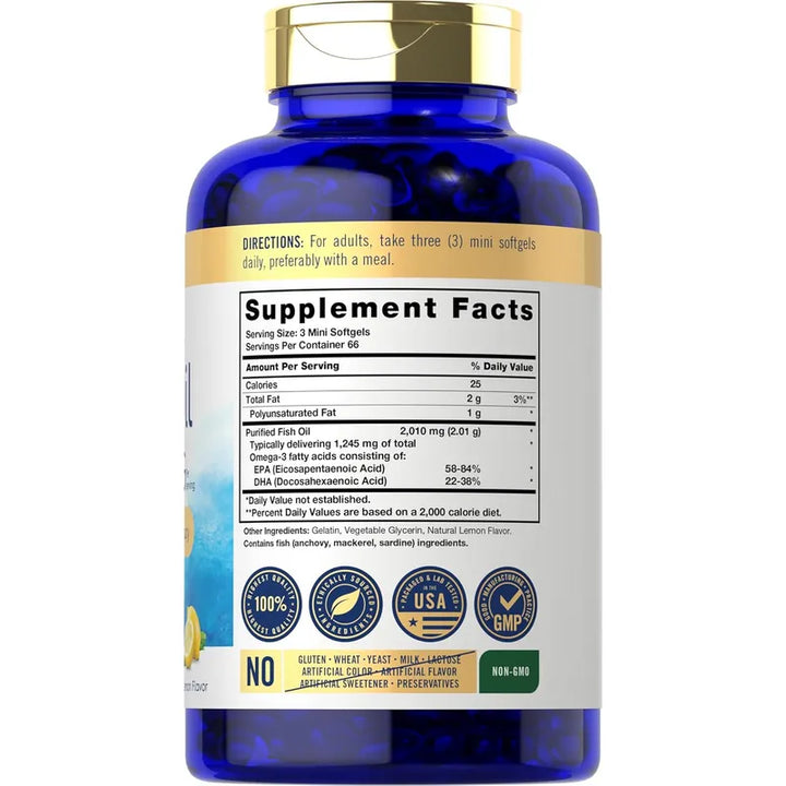 Nuestro aceite de pescado no solo es puro, sino que es una delicia para tus sentidos. A diferencia de otros suplementos, nuestro producto tiene un sutil sabor a limón que te encantará. Además, al ser naturalmente libres de gluten, OMG y conservantes, son ideales para todos.