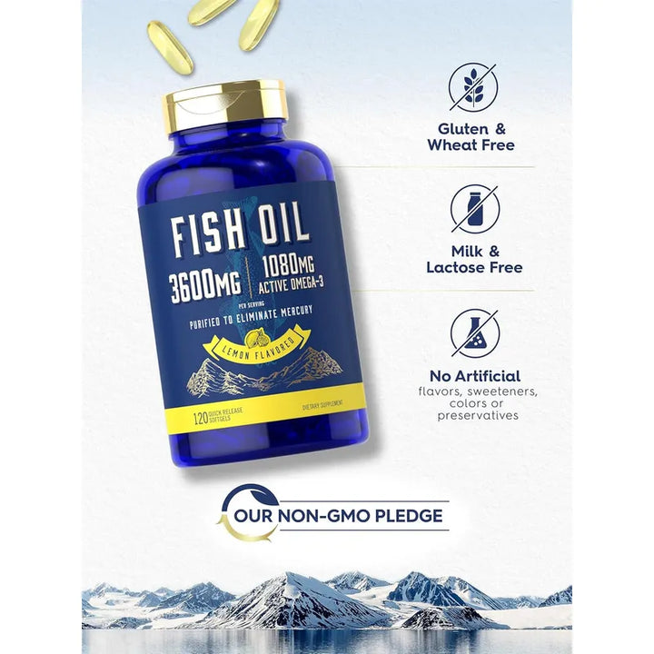 Imagina sentirte más vital y enérgico cada día. Nuestro aceite de pescado, con 3,600 mg por porción, está formulado para llevarte a un estado óptimo de salud. 🐟 Con 1080 mg de Omega 3, serás testigo de cómo tu cuerpo responde positivamente a este impulso de ácidos grasos esenciales. Un verdadero protector para tu corazón y cerebro, cada cápsula contiene nutrientes que tu cuerpo necesita para funcionar en su máxima capacidad.