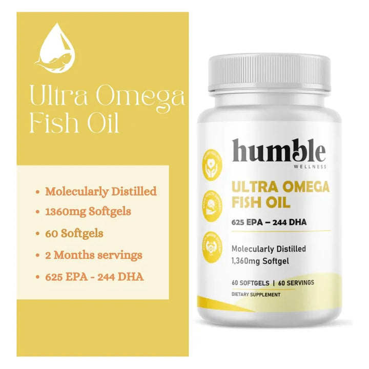 El Humble Ultra Omega trabaja incorporando ácidos grasos esenciales en tu sistema. Estos Omega-3 ultra concentrados son absorbidos eficazmente, ayudando a disminuir inflamaciones y apoyar la salud cardiovascular.