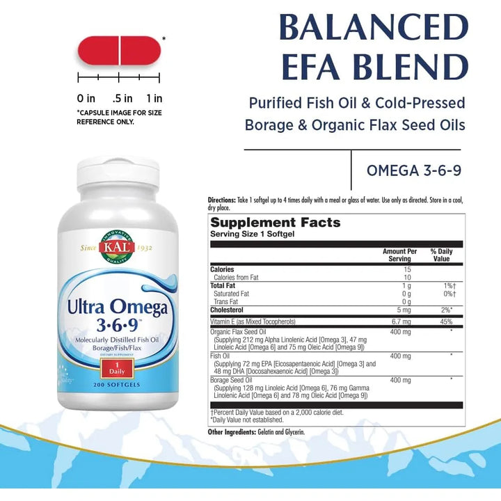 El KAL Ultra Omega 3-6-9 actúa desde la primera dosis. Los ácidos grasos esenciales se absorben rápidamente en tu organismo, llegando a donde más los necesitas. El omega 3 del aceite de pescado reduce la inflamación, mientras que el omega 6 de la borraja nutre tu piel y cabello. El omega 9 de la linaza apoya tu sistema cardiovascular. Juntos crean un efecto sinérgico que potencia tu salud en múltiples niveles.
