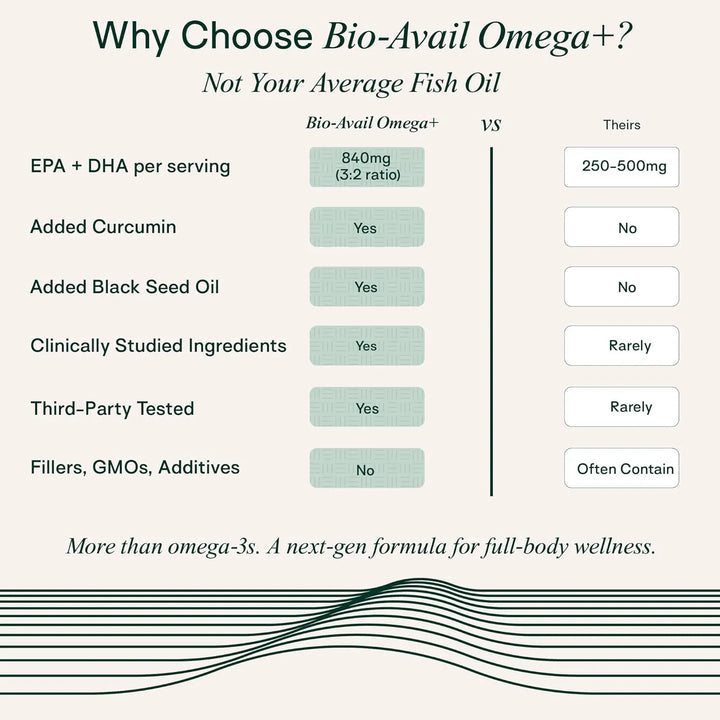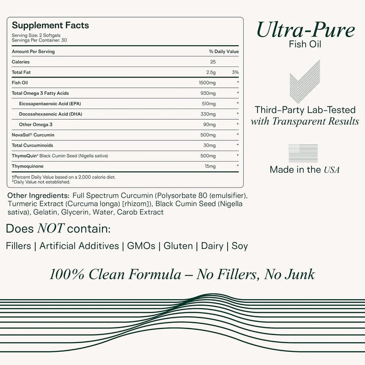 Este poderoso suplemento combina los beneficios del aceite de pescado ultra puro, con 1,500 mg de EPA y DHA, junto con curcumina biodisponible y aceite de semilla negra. Una fórmula única que trabaja en sinergia para brindarte resultados visibles. ¿Por qué conformarte con menos cuando puedes tener lo mejor?
