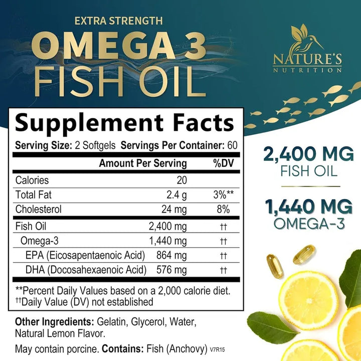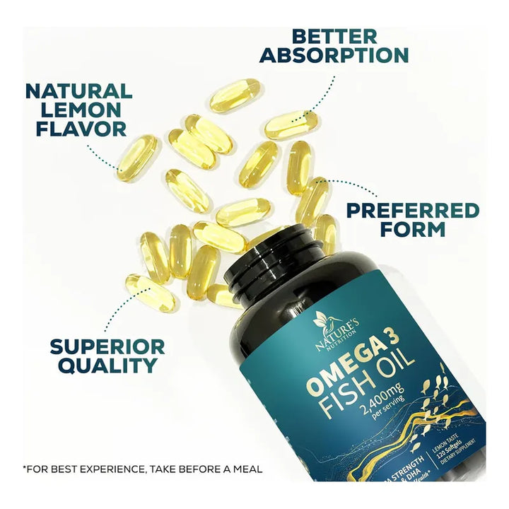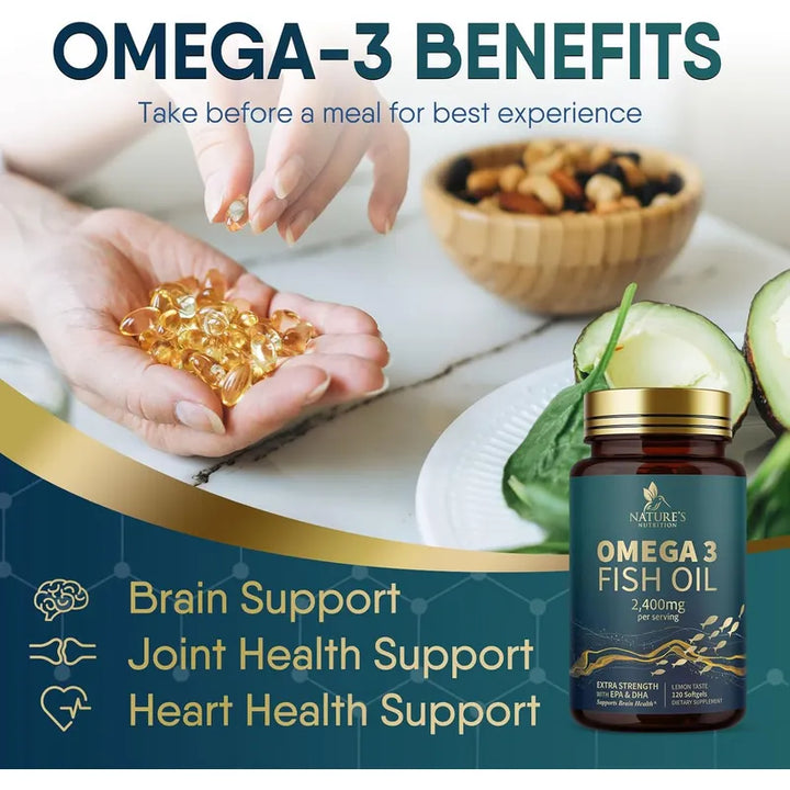 Nuestro producto contiene 2400 mg de omega-3, asegurando que recibas el más alto nivel de apoyo nutricional. El aceite de pescado ha sido probado y es de origen responsable, garantizándote la más alta calidad. Ya sea que estés buscando mejorar la función cerebral, proteger tu corazón o simplemente sentirte más saludable, cada cápsula rica en EPA y DHA te acerca un paso más a esos objetivos.