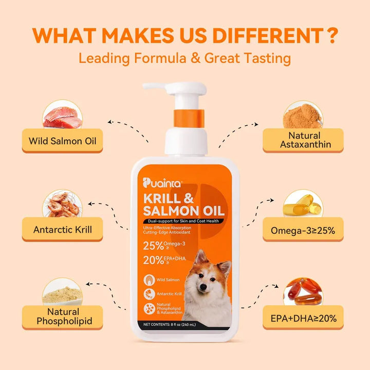 Imagina el frescor del salmón capturado en el Pacífico y el kril antártico, todo reunido en una fórmula sostenible y rica en nutrientes. Cada gota está diseñada para promover un pelaje lustroso y una piel saludable, convirtiendo cada momento en un paso hacia el bienestar integral de tu perro.