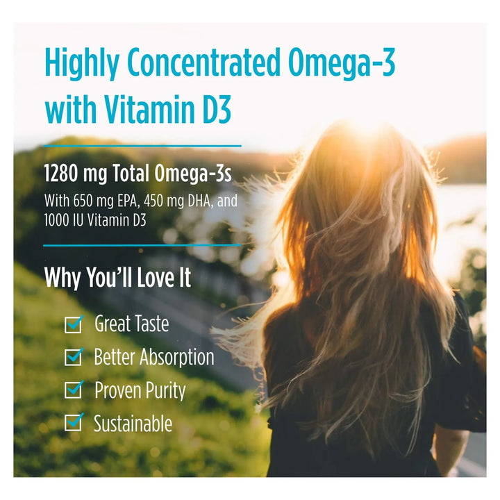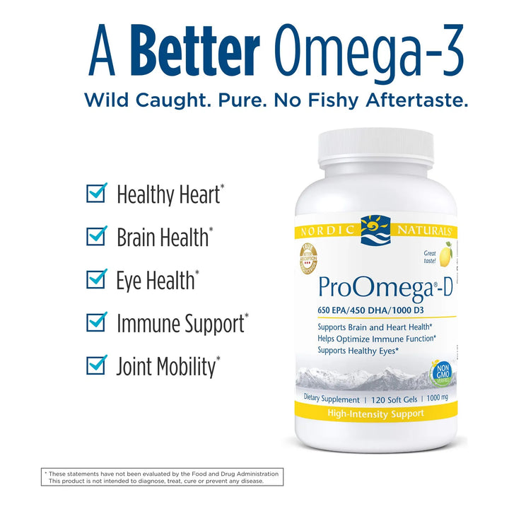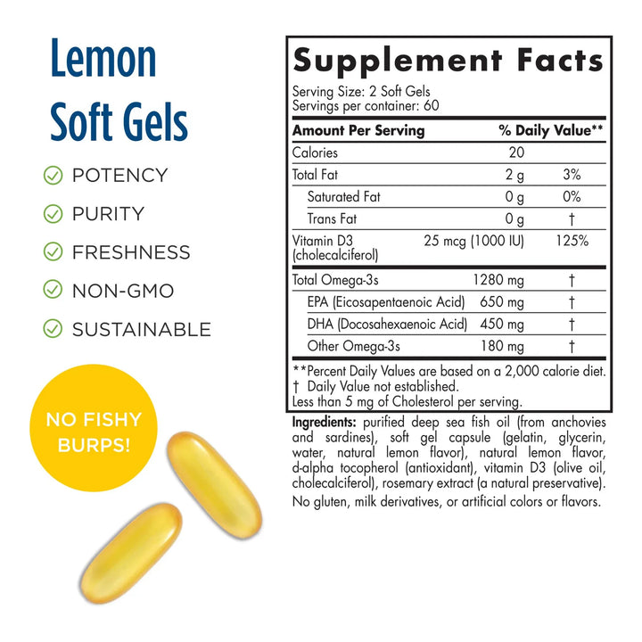 Cada gel suave de ProOmega-D contiene una potente combinación de 1280 mg de omega-3 (EPA y DHA) y 1000 UI de vitamina D3. Estos nutrientes esenciales trabajan en sinergia para apoyar funciones vitales de tu cuerpo, desde la salud cardiovascular hasta la claridad mental. ¿Lo mejor? Su fresco sabor a limón y tecnología avanzada eliminan los molestos eructos de pescado, haciendo que cuidarte sea un placer.