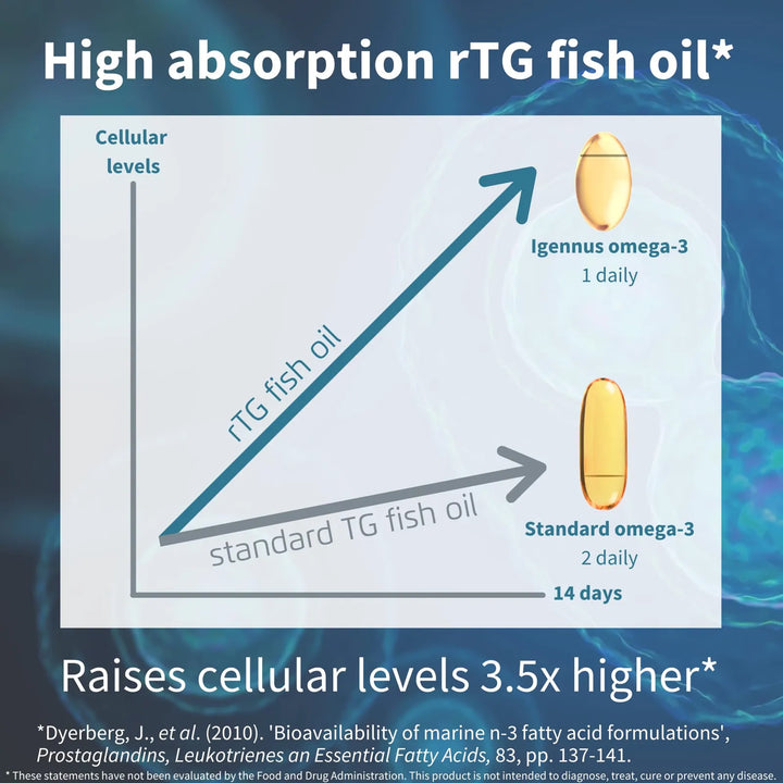 ¿Cansado de suplementos que prometen mucho pero no cumplen? Nuestro aceite de pescado en forma de triglicéridos reesterificados (rTG) garantiza una absorción 3.5 veces mayor que los productos convencionales. Esto significa que tu cuerpo aprovecha al máximo cada gota de omega-3, llevando nutrientes esenciales directamente a tus células para una acción rápida y efectiva.