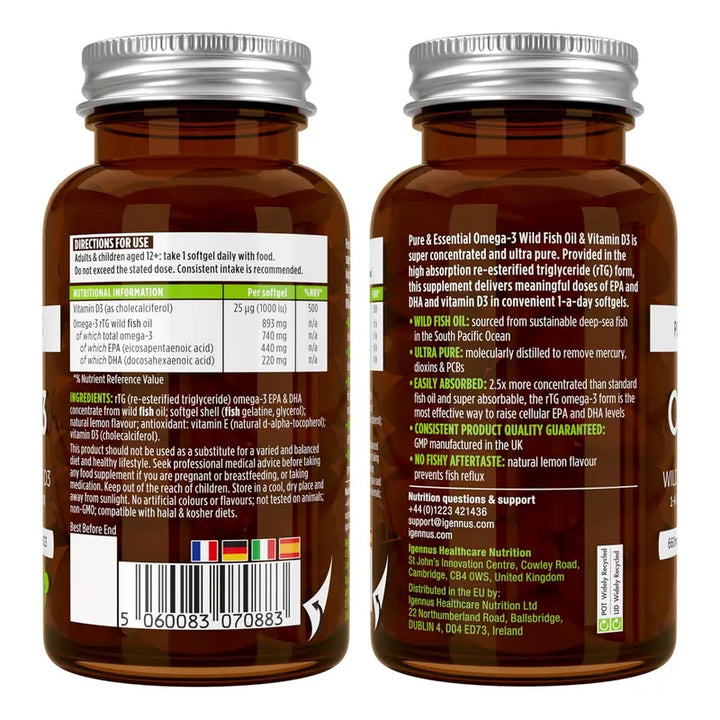 La exclusiva fórmula de triglicéridos reesterificados asegura una absorción óptima, proporcionando 3,5 veces más efectividad que los aceites de pescado estándar. Además, la pureza está garantizada al estar certificado por IFOS, asegurando que cada gota está libre de toxinas ambientales y metales pesados, cuidando de ti y del planeta.