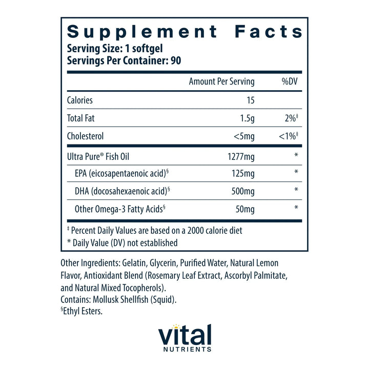 El DHA, un ácido graso omega-3 presente en este suplemento, es un componente esencial de las membranas celulares del cerebro y los ojos. Al consumir regularmente las cápsulas de Ultra Pure Fish Oil, estás proporcionando a tu cuerpo los nutrientes necesarios para mantener una función cerebral óptima, apoyar el desarrollo cognitivo (especialmente en etapas clave como el embarazo) y promover la salud ocular.