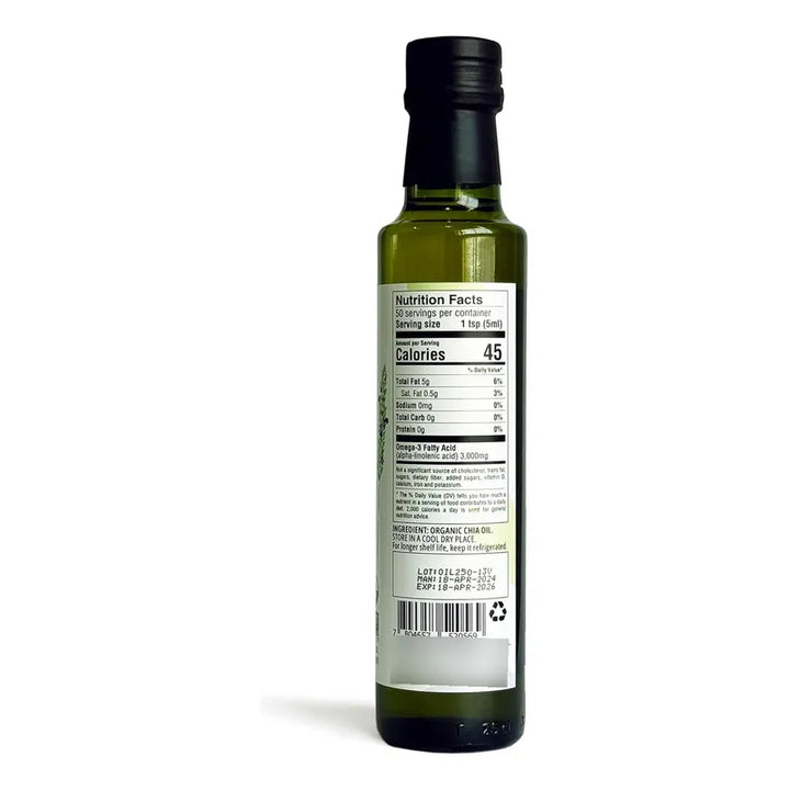 Descubre el Aceite de Semilla de Chía Orgánico Prensado en Frío, tu aliado natural para una vida más saludable. Imagina un producto que, en solo una pequeña dosis diaria, entrega más del doble de los ácidos grasos omega 3 ALA necesarios para tu bienestar.