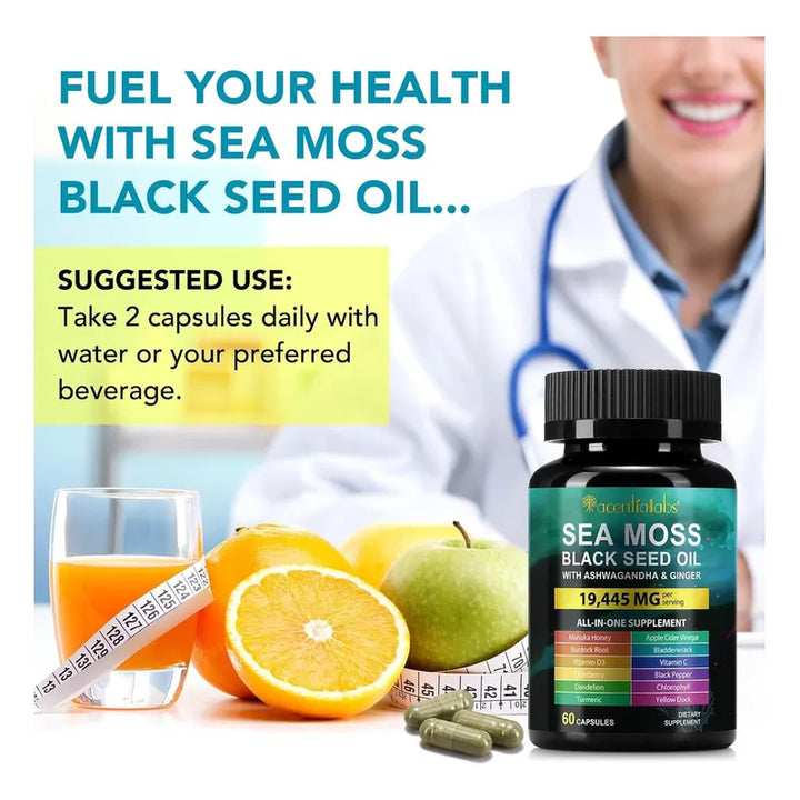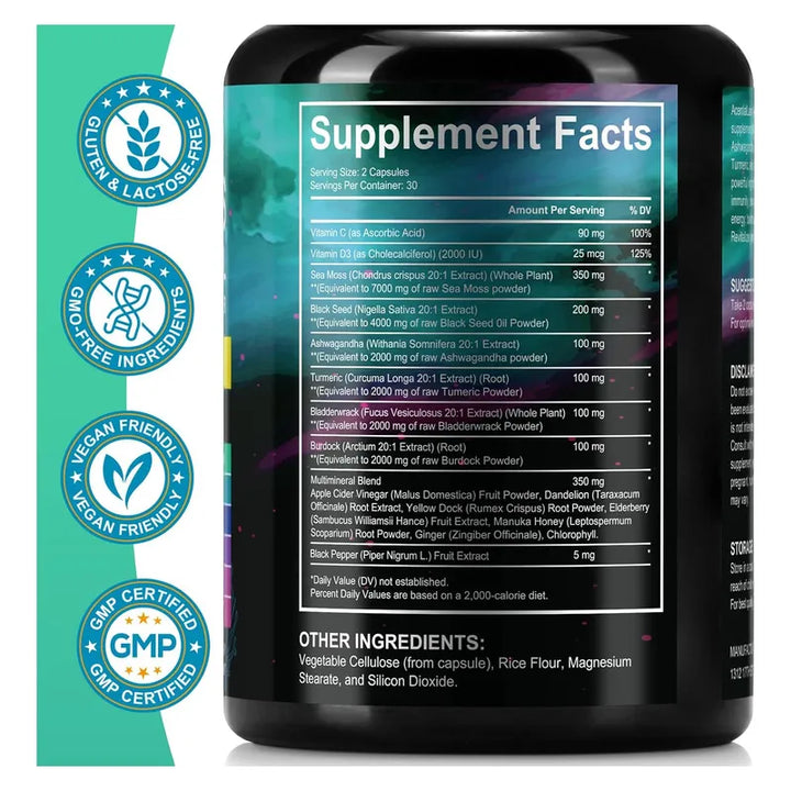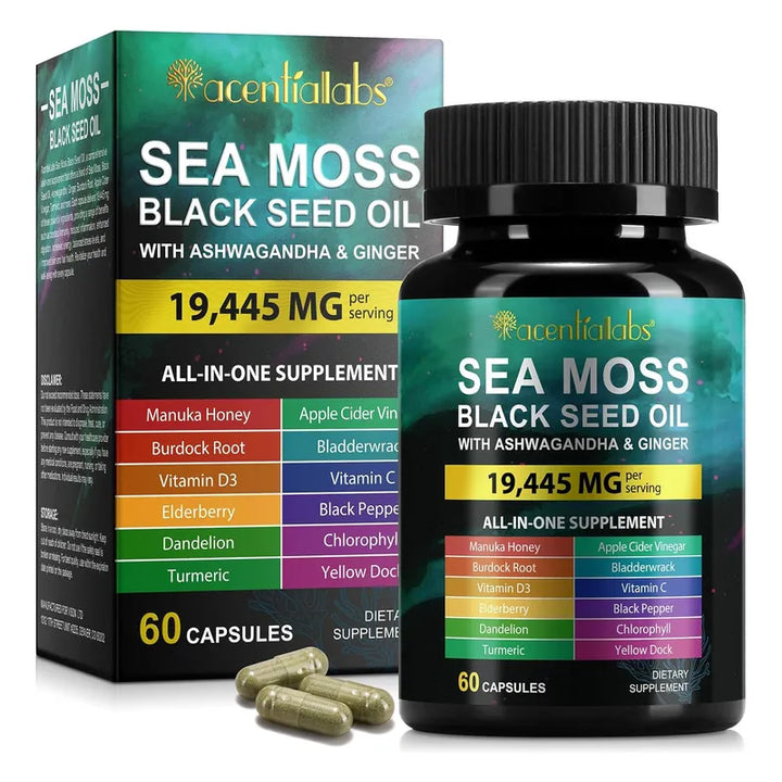 Imagínate sintiéndote revitalizado cada día, con la energía que necesitas para enfrentar cualquier desafío. ¿Te preocupa el desorden de tener que tomar innumerables suplementos diariamente? Deja que este suplemento integral haga el trabajo pesado por ti. Nuestra cápsula todo en uno combina lo mejor de la naturaleza con una mezcla potente de aceite de semilla negra, musgo marino, ashwagandha, y jengibre, entre otros. Este no es solo otro producto más, es la solución completa para quienes buscan mejorar su bienestar sin complicaciones.