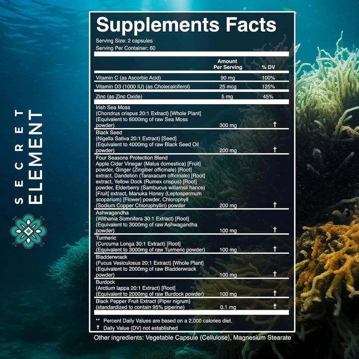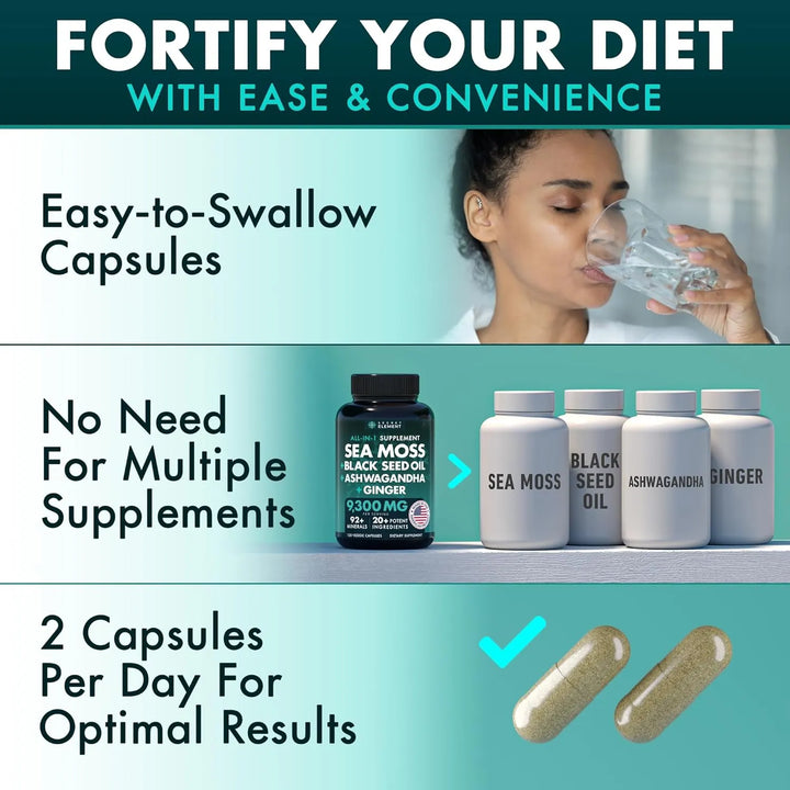 Imagina un suplemento que reúne lo mejor de la naturaleza en una sola cápsula. El Aceite de Semilla Negra, Musgo Marino Irlandés, Ashwagandha y Jengibre se unen para ofrecerte un apoyo integral a tu bienestar. Con 20,000 mg por porción, este suplemento es tu aliado perfecto para fortalecer tu sistema inmunológico, reducir el estrés y mantener niveles de energía equilibrados. ¿No sería increíble sentirte más vital y protegido cada día?