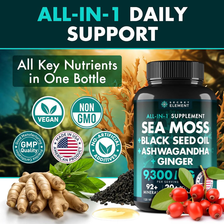 Aceite De Semilla Negra Musgo Marino Ashwagandha Jengibre 120 Cápsulas 20000 Mg