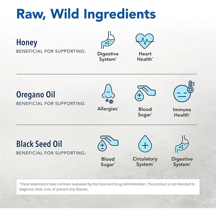 El Apoyo Respiratorio e Inmunológico actúa directamente en tu sistema respiratorio e inmunológico gracias a sus ingredientes activos. La semilla negra y el aceite de orégano P73 trabajan juntos para despejar las vías respiratorias y fortalecer tus defensas, mientras que la miel cruda suaviza y protege el tracto bronquial. La micelización asegura que estos componentes se absorban de manera óptima, maximizando sus beneficios.
