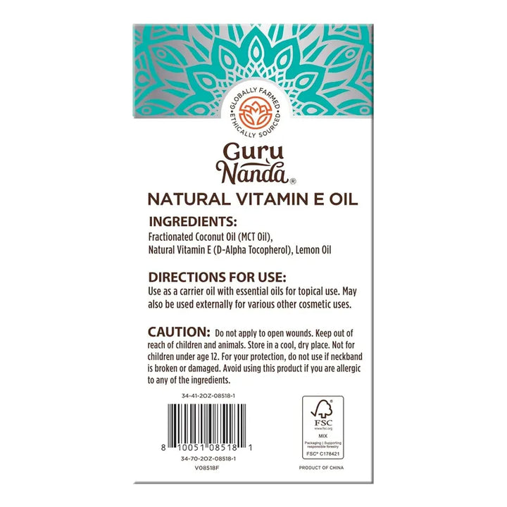 Aceite De Vitamina E Puro Natural GuruNanda 60 Ml Para Piel Y Cabello
