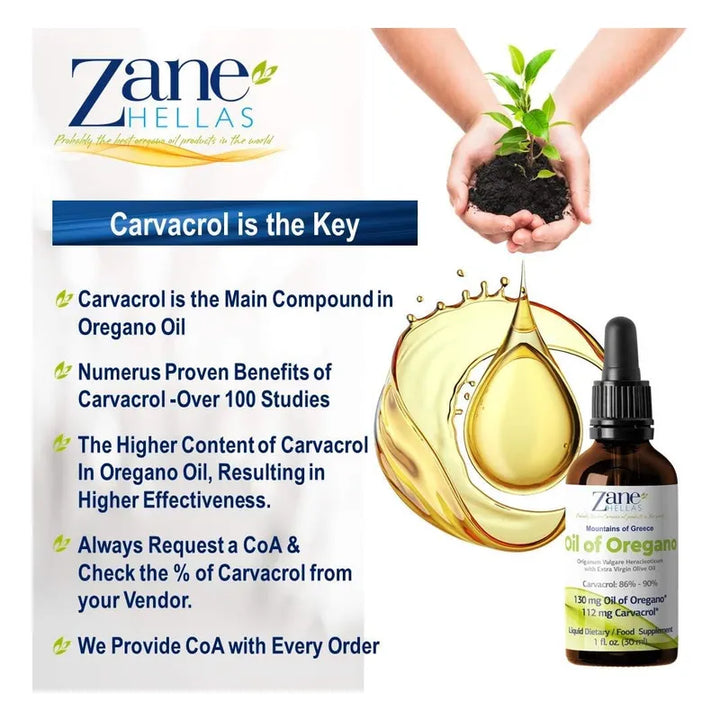 Utilizando el carvacrol, su compuesto estrella, el aceite orégano de Zane Hellas eleva tu salud a un nuevo nivel. Con más de 100 estudios respaldándolo, este compuesto no solo apoya tu sistema inmunológico, sino que también actúa eficientemente para aliviar el malestar. 🛡️ Nuestro enfoque está en maximizar los beneficios naturales del orégano, brindándote confianza y tranquilidad en cada dosis.