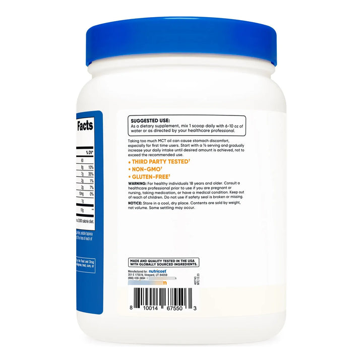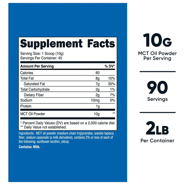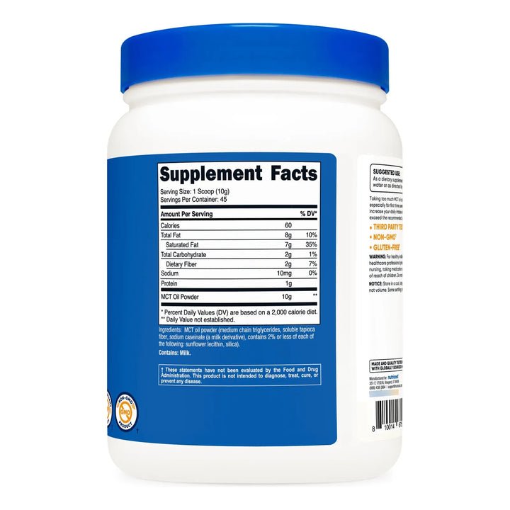 Este aceite en polvo no solo es conveniente, sino que también es 100% libre de OMG, soja y gluten, lo que lo hace ideal para personas con sensibilidades alimentarias. Su fórmula de triglicéridos de cadena media (MCT) se absorbe rápidamente en tu cuerpo, proporcionándote un impulso de energía inmediato sin los altibajos de los azúcares refinados. ¿Listo para dar el siguiente paso en tu bienestar?