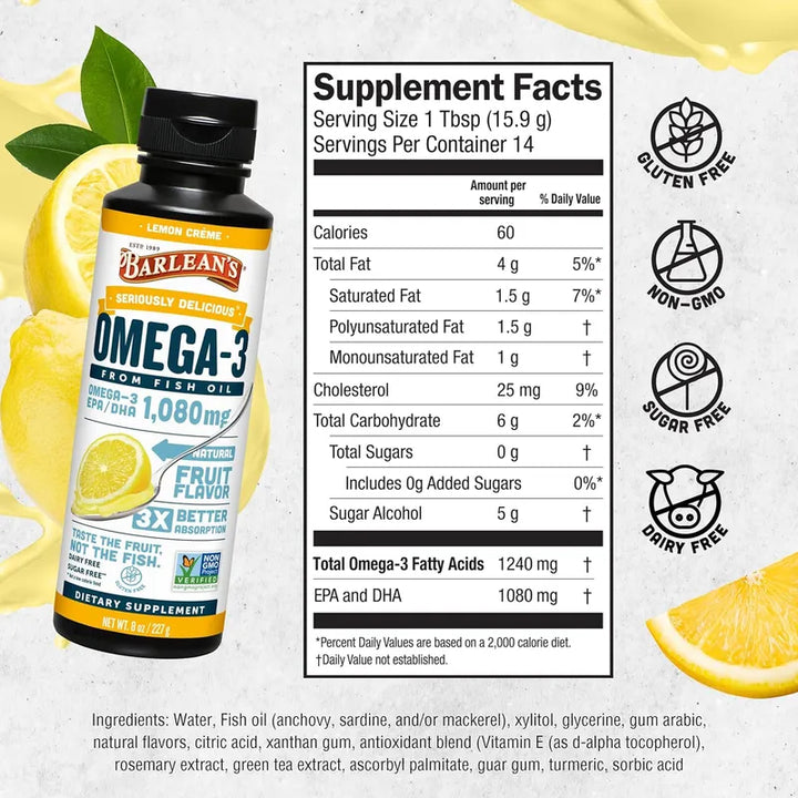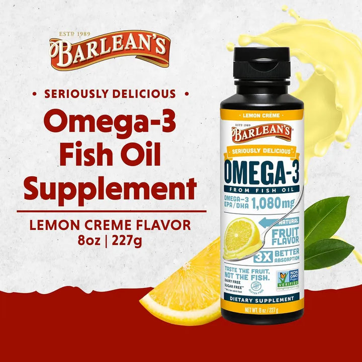 Imagina disfrutar de todos los beneficios del omega 3 sin la molestia del típico sabor a pescado. Presentamos el exquisito Aceite de Pescado Omega 3 de Barlean's, con un sabor irresistible a crema de limón que tanto los niños como los adultos adorarán. 🚀