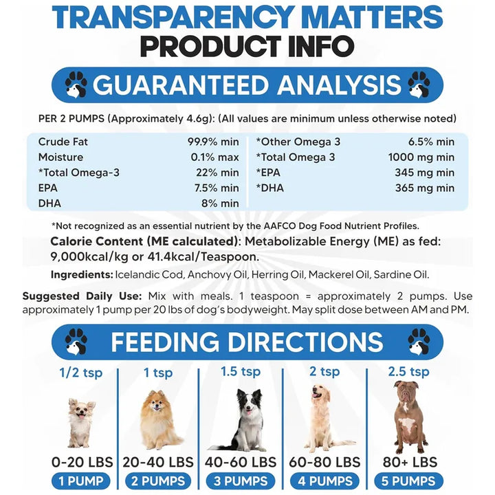 Con ingredientes seleccionados de las aguas cristalinas de Islandia, nuestro aceite de pescado contiene anchoas, arenque, caballa y sardinas, combinando lo mejor de la naturaleza para ofrecer una solución efectiva, segura y sin toxinas para tus perros. ¡Adiós a los olores desagradables! Gracias a su destilado molecular, puedes estar seguro de ofrecer un producto de grado humano.
