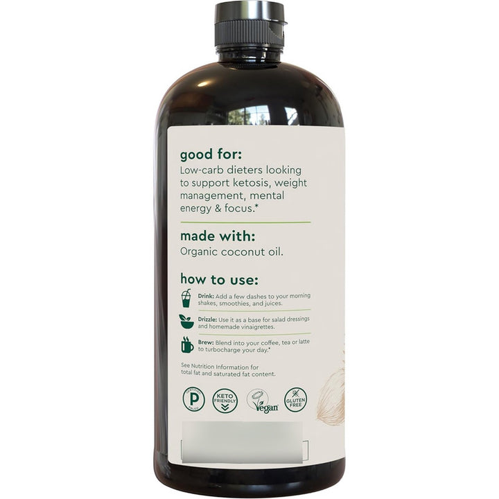 El Poder de los Triglicéridos de Cadena Media (MCT) eleva tu nivel de energía mientras sigues tu dieta cetogénica. Con cada cucharada, experimenta una concentración mental mejorada y una resistencia duradera. Puedes decir adiós a la niebla mental y a la fatiga. Nuestro aceite, sin OMG, sin gluten y vegano, está diseñado para quienes desean lo mejor para su cuerpo y mente.