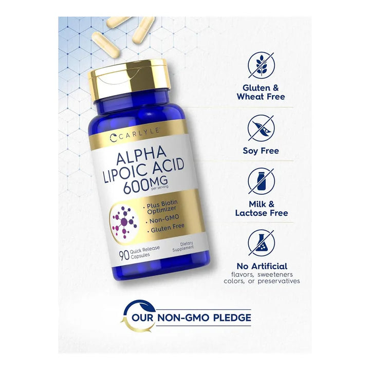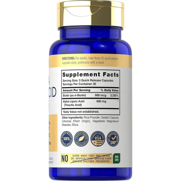 Este suplemento avanzado no solo contiene una forma premium de ALA, sino que está optimizado con biotina, proporcionando un impulso adicional a tu bienestar. ¿Te preocupa la exposición diaria a radicales libres y el envejecimiento prematuro? Aquí encuentras la solución. Nuestra fórmula avanzada integra 600 mg de ácido alfa lipoico junto a 999 mg de biotina por porción, todo ello en cápsulas de liberación rápida, asegurando una absorción eficiente y rápida.