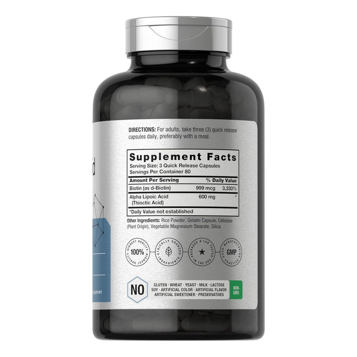 Con una fórmula desarrollada por expertos, te ofrecemos no solo la cantidad ideal de ALA, sino también 999 mcg de biotina, mejorando el metabolismo y el bienestar general. Si te importa lo que pones en tu cuerpo, este producto es tu elección perfecta: es naturalmente libre de gluten, OMG y aditivos artificiales.