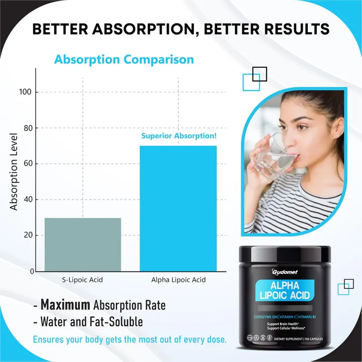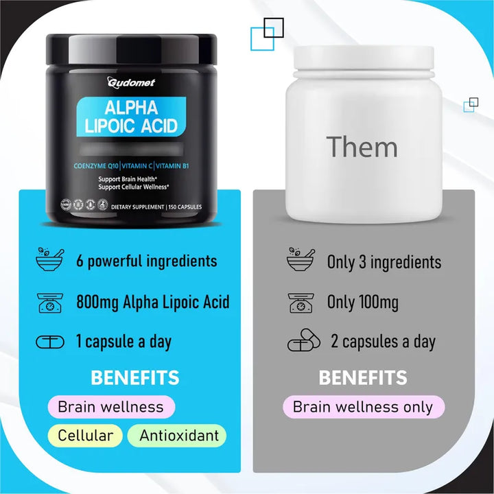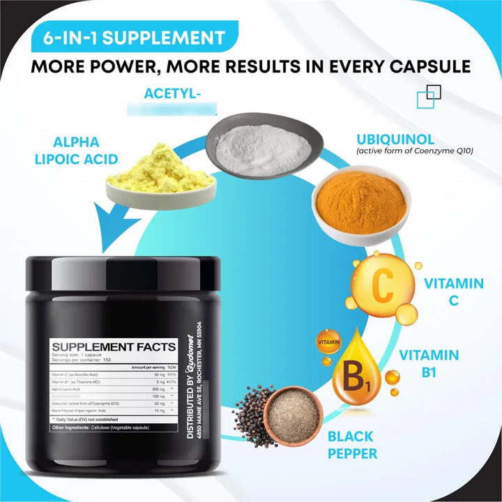 Imagina un suplemento que no solo nutra tu cuerpo, sino que también impulse tu salud cerebral y potencia tus defensas antioxidantes. Estamos emocionados de ofrecerte nuestro Ácido Alfa Lipoico ultra potente con 800 mg por cápsula, enriquecido con CoQ10, vitamina C y B1.