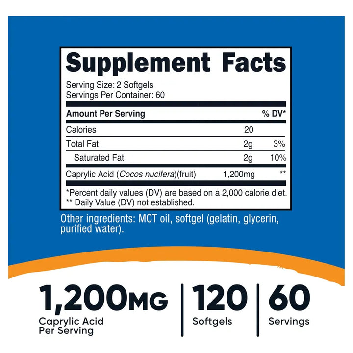 Cada porción de nuestras 120 cápsulas blandas te proporciona 1200 mg del mejor ácido caprílico, permitiéndote disfrutar plenamente de sus beneficios antimicóticos. Al ser un suplemento libre de OMG y sin gluten, está especialmente formulado para aquellos que buscan opciones más saludables sin comprometer la calidad.