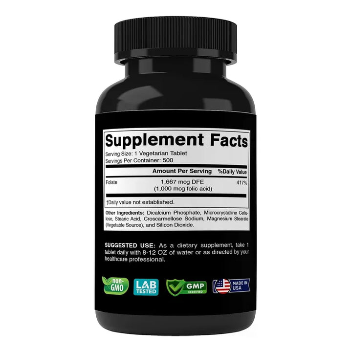 Ácido Fólico 1 Mg 500 Tabletas Vegetariana Vitamina Esencial