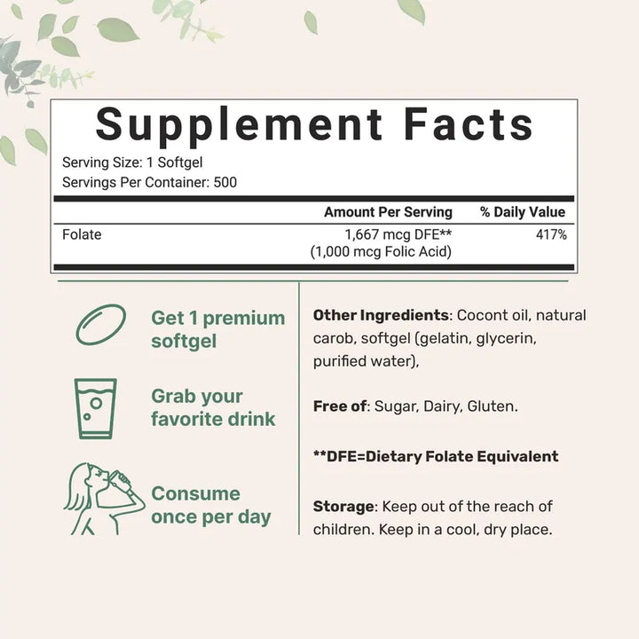 Acido Folico 1000 Mcg 500 Capsulas Blandas Aceite De Coco Vitaminas Prenatales