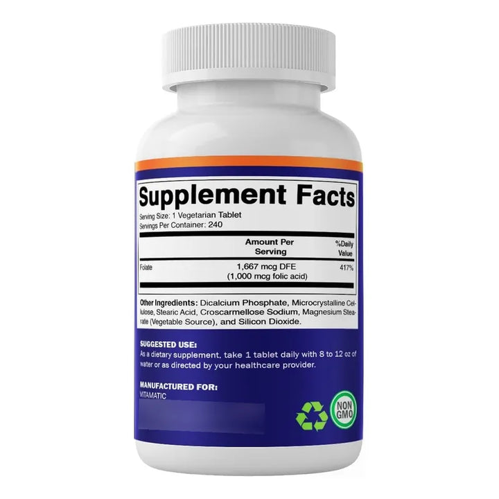 El ácido fólico es esencial en la producción de material genético, lo que es crucial para el desarrollo celular y el crecimiento saludable. Cada tableta está diseñada para optimizar la absorción y ayudar a mantener niveles adecuados de vitamina B9.