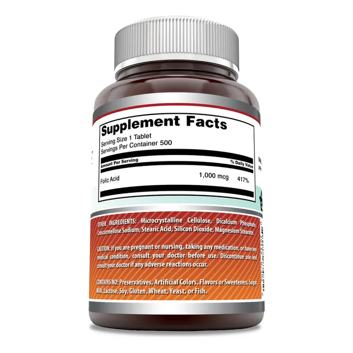 Ácido Fólico 1000 Mcg Vitamina B9 Tabletas 500 Unidades Eficiencia Garantizada