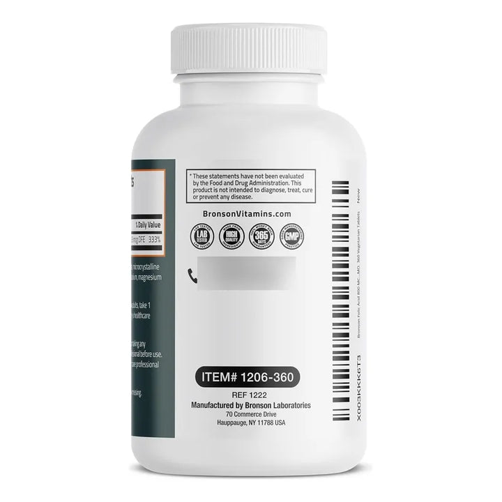 Podrías estar preguntándote, "¿Por qué el ácido fólico Bronson?" Además de su fórmula sin OMG, sin gluten y sin soja, estas mini tabletas están probadas en laboratorio para asegurar pureza y potencia, proporcionando 800 MCG de vitamina B9 en cada porción. Todos los productos se fabrican en instalaciones de última generación en Nueva York, con estándares cGMP, garantizando que cada tableta cumpla las regulaciones actuales de calidad y seguridad.