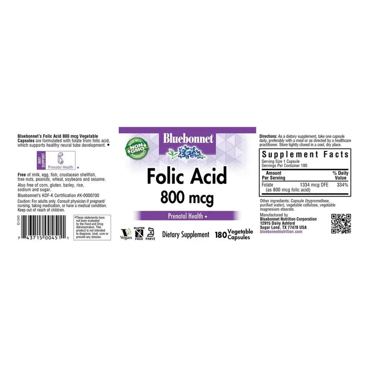 Acido Folico 800mcg BlueBonnet Capsulas Vegetales Salud Neurologica Vegan