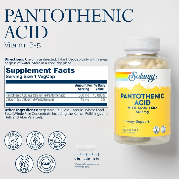 Ácido Pantoténico 500 Mg Solaray Vitamina B5 Energía Piel Cabello Uñas Vegano