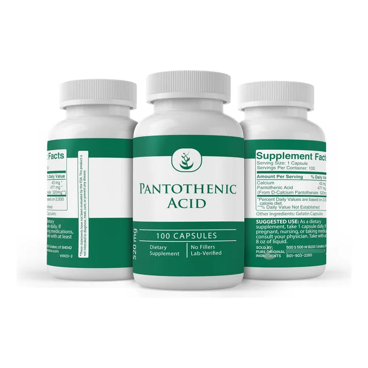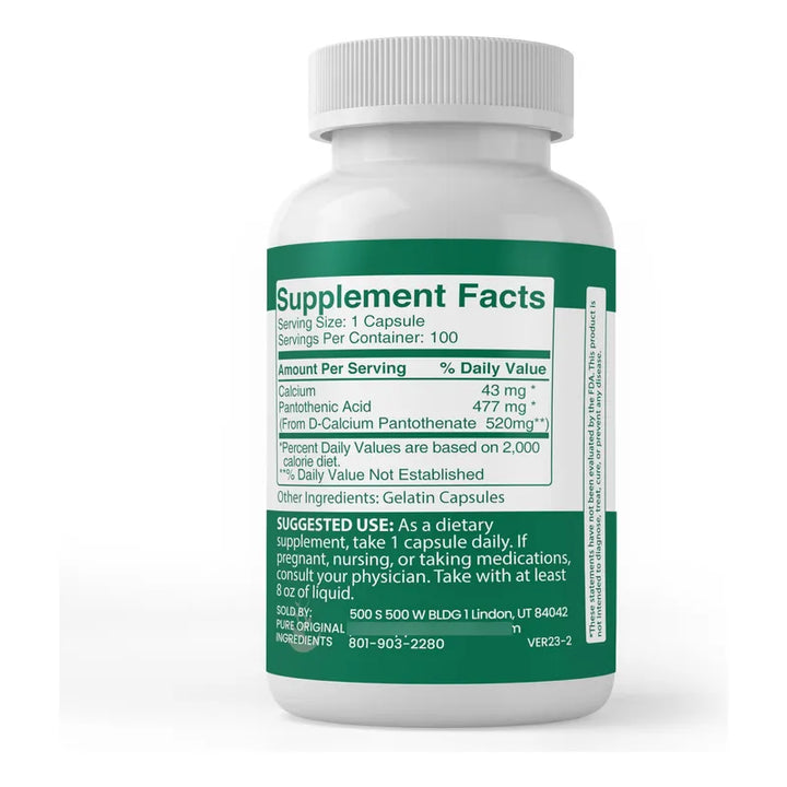 ¿No sería maravilloso tener un suministro de bienestar que dure más de tres meses sin preocuparte cada semana por reponerlo? Nuestro producto te ofrece justo eso: 100 cápsulas llenas de pureza y simplicidad. Cada cápsula está compuesta por ácido pantoténico, una fuente natural de vitamina B5 y calcio, esenciales para tu bienestar diario.