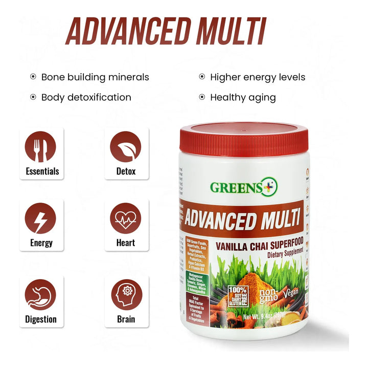 Imagina despertar cada mañana con energía radiante, sintiendo que tu cuerpo está listo para conquistar el día. Con Advanced Multi Vanilla Chai Superfood, no solo obtienes una dosis poderosa de nutrientes, sino una solución holística diseñada para potenciar tu bienestar desde adentro. Este polvo revolucionario combina lo mejor de la naturaleza: alimentos verdes crudos, superfrutas y verduras de mar, todo en una mezcla deliciosa que te hará sentir vivo como nunca antes.