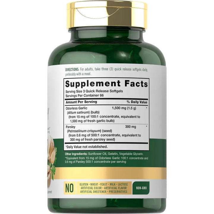 El ajo y el perejil se combinan en una cápsula que ofrece el equivalente a 1,500 mg de ajo por porción. Este dúo no solo enriquece tu dieta con nutrientes esenciales, sino que lo hace de manera completamente inodora, asegurando que puedas disfrutar de todas las ventajas del ajo sin el aroma fuerte.