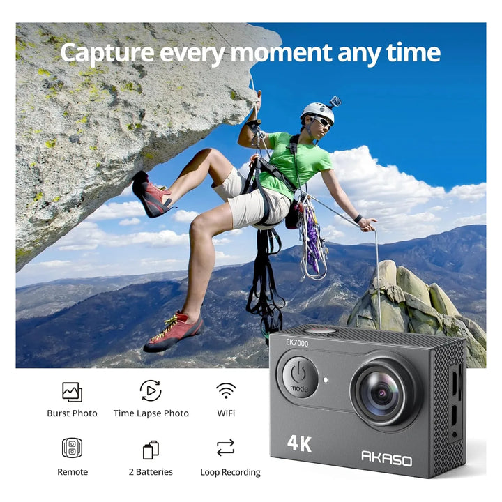¿Cansado de perder esos momentos increíbles porque tu cámara no está a la altura? Imagina poder grabar cada salto, cada buceo y cada carrera con una claridad impresionante, como si fueras un cineasta profesional. La AKASO EK7000 no es solo una cámara, es tu compañera de aventuras, diseñada para resistir lo que tú resistes y capturar lo que tus ojos ven, pero con detalles que ni siquiera tú logras percibir.