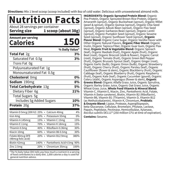 ¿Cansado de productos que prometen mucho pero no cumplen? Este alimento en polvo es diferente. Con 33g de proteínas vegetales por porción, incluyendo todos los aminoácidos esenciales, tu cuerpo recibirá el combustible que necesita para mantenerse fuerte y saludable. Además, su combinación única de fibra soluble e insoluble (0.49 oz) no solo te mantendrá satisfecho por más tiempo, sino que también apoyará tu digestión de manera natural.