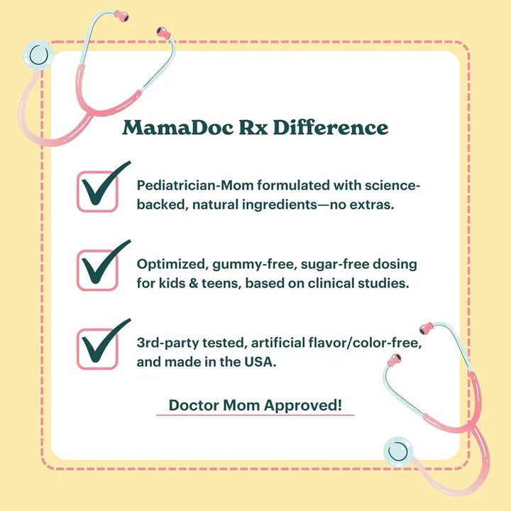 Imagina un producto creado por quienes más saben sobre el cuidado de los niños: las madres pediatras. MamaDoc Rx es el resultado del deseo inquebrantable de ofrecer solo lo mejor para nuestros propios hijos. Estos masticables no solo son veganos y libres de azúcar, sino que también son increíblemente deliciosos, garantizando una experiencia que tus hijos amarán.