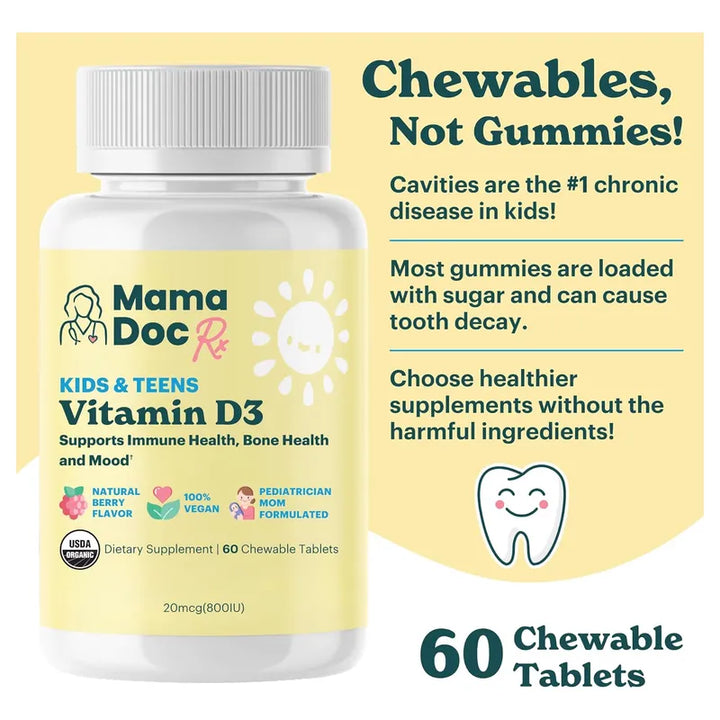 ¡Descubre una forma deliciosa y saludable de complementar la alimentación de tus hijos con MamaDoc Rx! Nuestros alimentos integrales orgánicos masticables con Vitamina D3 han sido diseñados pensando en lo que más importa: el bienestar y la salud integral de los niños y adolescentes.