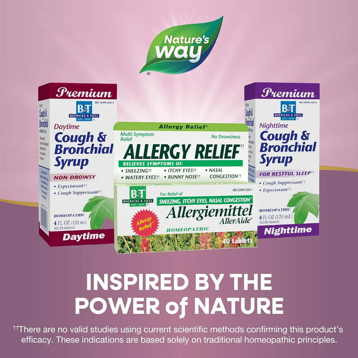 Nature's Way Boericke & Tafel AllerAide utiliza una combinación de ingredientes homeopáticos que trabajan en sinergia para calmar los síntomas de alergia. Su acción rápida ayuda a reducir la inflamación y la irritación en las vías respiratorias y los ojos, proporcionando alivio casi inmediato. La fórmula está diseñada para ser suave con el cuerpo pero potente contra los síntomas.