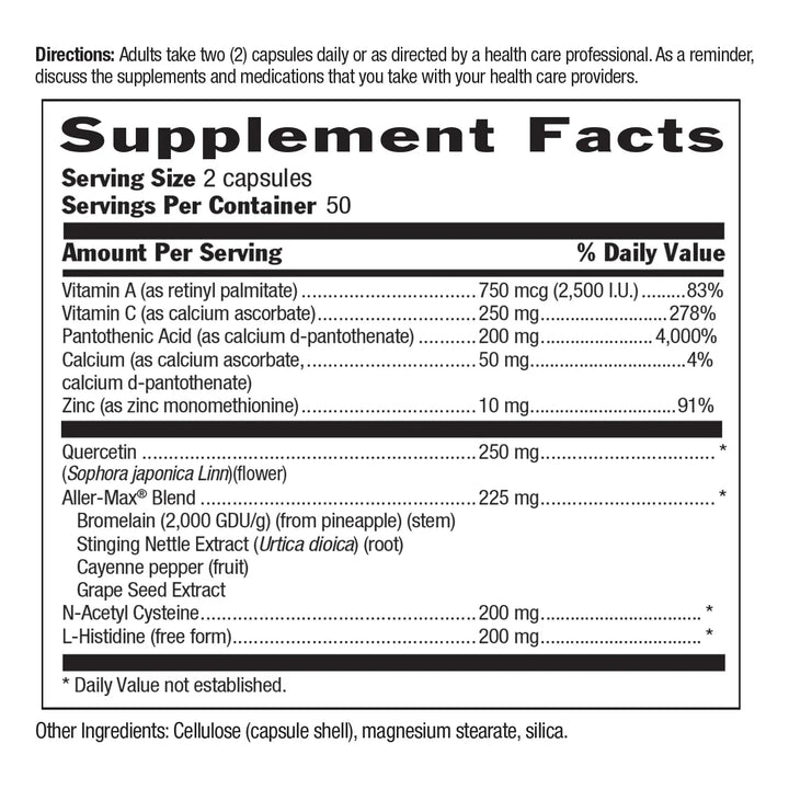 Aller-Max actúa como un escudo natural para tu sistema inmunitario. La quercetina, un bioflavonoide derivado de brotes de flores, ayuda a estabilizar las células que liberan histamina, reduciendo así las reacciones alérgicas. La bromelina, por su parte, mejora la absorción de la quercetina y tiene propiedades antiinflamatorias. La vitamina C y el zinc completan esta fórmula potente, apoyando la producción de glóbulos blancos y fortaleciendo tus defensas.