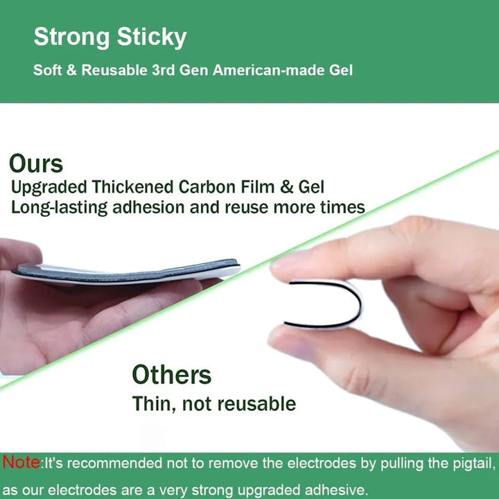 Estas almohadillas, con un renovado diseño de película de carbón para una mejor conductividad, se centran en ofrecer una cobertura uniforme y eficaz. Ya sea que necesites abordar dolores en el brazo, rodilla o cualquier otra área, están diseñadas para ofrecer una estimulación músculo-relajante óptima. Nunca más te sentirás limitado por la falta de adhesión. La compatibilidad universal asegura su funcionalidad con la mayoría de masajeadores y dispositivos de electroterapia, permitiéndote centrarte únicamente en tu bienestar.