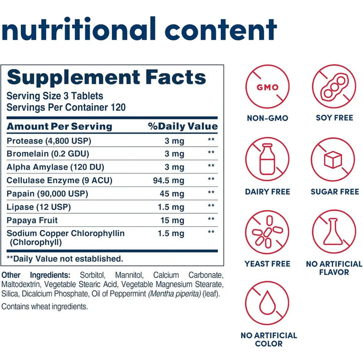 Estas tabletas masticables actúan descomponiendo proteínas y carbohidratos en partículas más pequeñas, incrementando su digestibilidad y mejorando la absorción de nutrientes en el organismo. Esto no solo evita la sensación de pesadez después de las comidas sino que también promueve un bienestar digestivo a largo plazo.